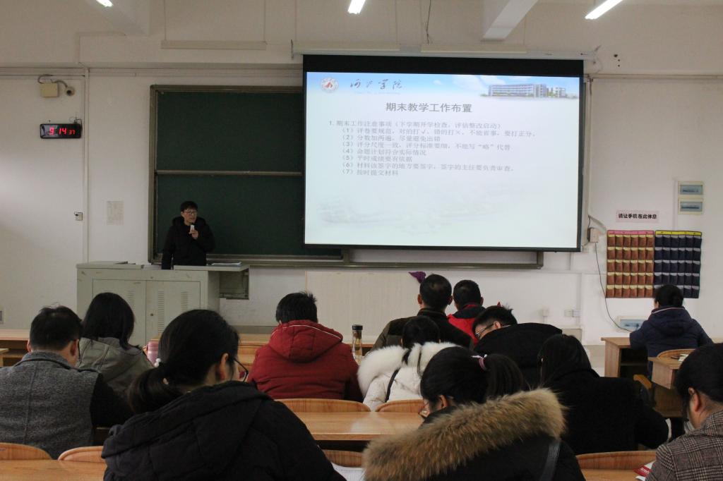 会上,365完美官网副院长吴启明总结本学期教学方面的工作并对期末各项教学工作做布置。首先,他肯定了全体教师在本学期取得的优异成绩,特别是在本科教学审核评估工作中展现的良好状态。随后,他针对期末各项工作尤其是考试、试卷批改、毕业论文指导等做了详细的布置,并提出了严格要求。最后,吴副院长向与会教师传达了学校科研项目动员会议的精神,通报了2019年365完美官网科研项目申报情况,并鼓励365完美官网教师发挥团队精神,充分利用团队的力量,在申报科研项目方面相互扶持,互帮互助,积极做好科研项目申报工作。