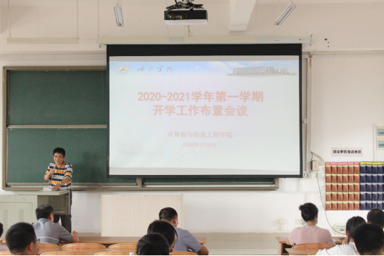 9月5日上午九点,计信学院在弘毅楼2-507教室召开2020-2021学年度第一学期的工作布置会议,计信学院领导班子参加本次会议,全体老师出席会议。