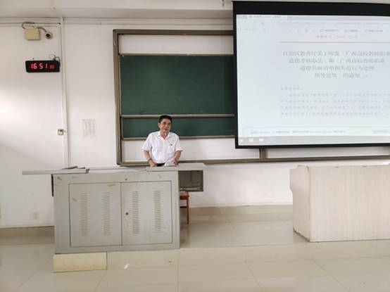 党委书记彭金松在会上布置民主生活会的相关工作,要求各支部在相应的时间内完成民主生活会。以及传达广西职业道德考核办法和广西高校教师职业道德负面清明和失范行为处罚指导意见的文件精神,提醒各位教师们遵守职业道德,争做四有好老师。