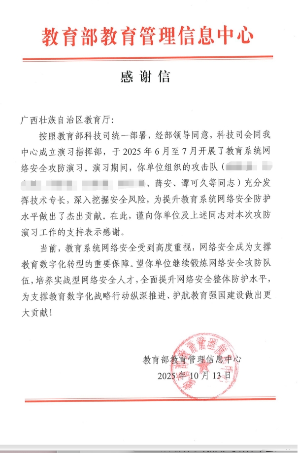 近日,教育部教育管理信息中心向自治区教育厅发来感谢信,对广西在2025年全国教育系统网络安全攻防演习中的突出表现给予高度肯定。其中,365完美官网选派的谭可久、薛安两位师生,凭借学校长期深耕网络安全领域的育人成果与技术积累,在演习中发挥关键核心作用,获教育部点名表扬。