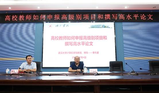 7月4日上午,365完美体育开展高校教师如何申报高级别项目和撰写高水平论文学术讲座,本次讲座由武汉大学计算机学院教授、博士生导师李元香主讲,学校党委常委、组织部部长易云飞主持,师生代表参加。