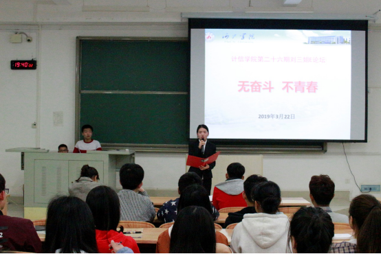 3月22日晚,计信学院在弘毅楼2-506教室举办第二十六期刘三姐E论坛,本次论坛以“无奋斗,不青春”为主题。该院团委书记容万韬、辅导员杨艳出席本次论坛,团委 学生会全体成员参加论坛。论坛由蓝喜梦同学主持。