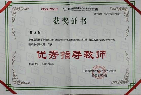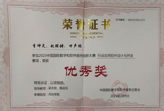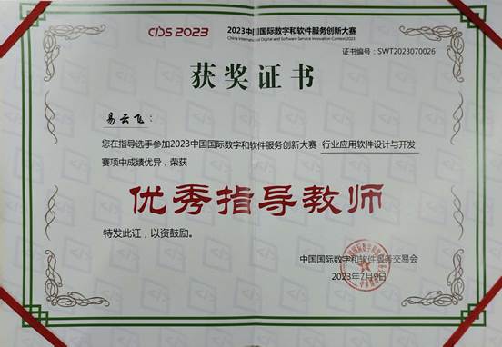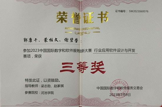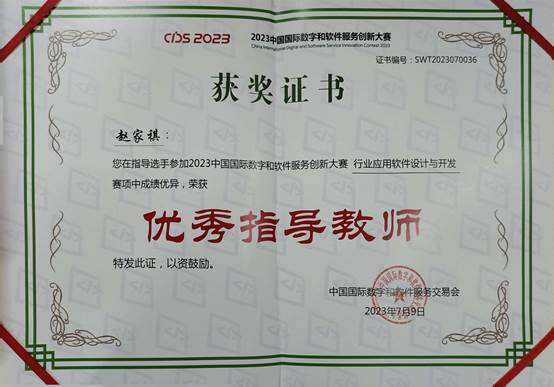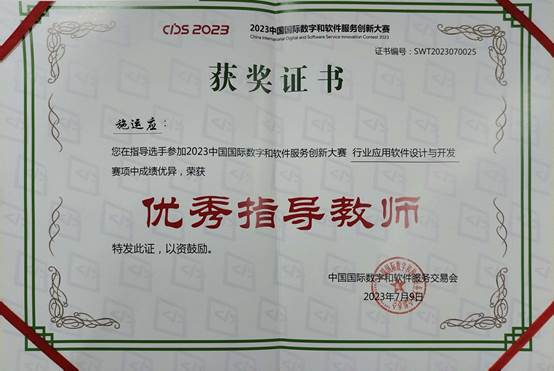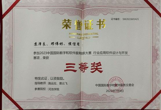 近日,收到从中国国际数字和软件服务交易会发来的获奖证书,365完美官网365完美体育在2023中国国际数字和软件服务创新大赛全国总决赛中获得全国三等奖两项,优秀奖一项,优秀指导教师四项。